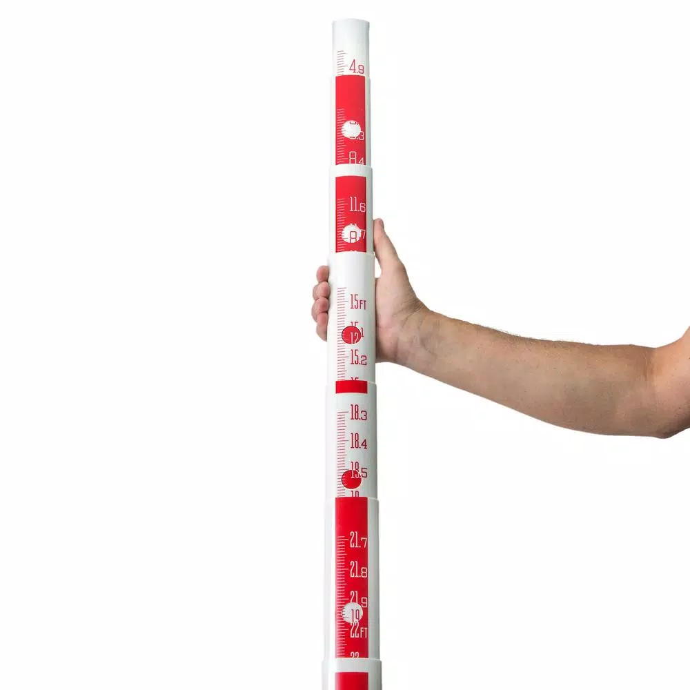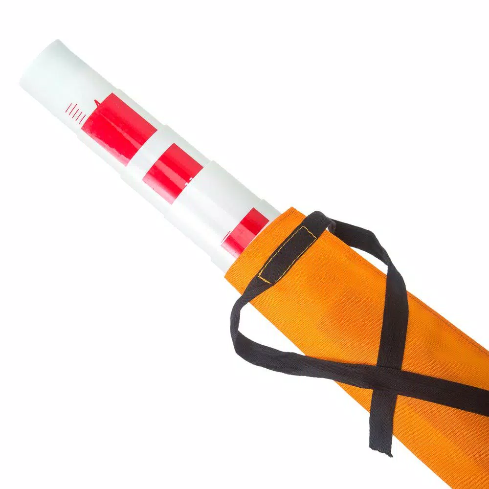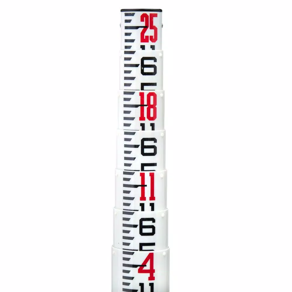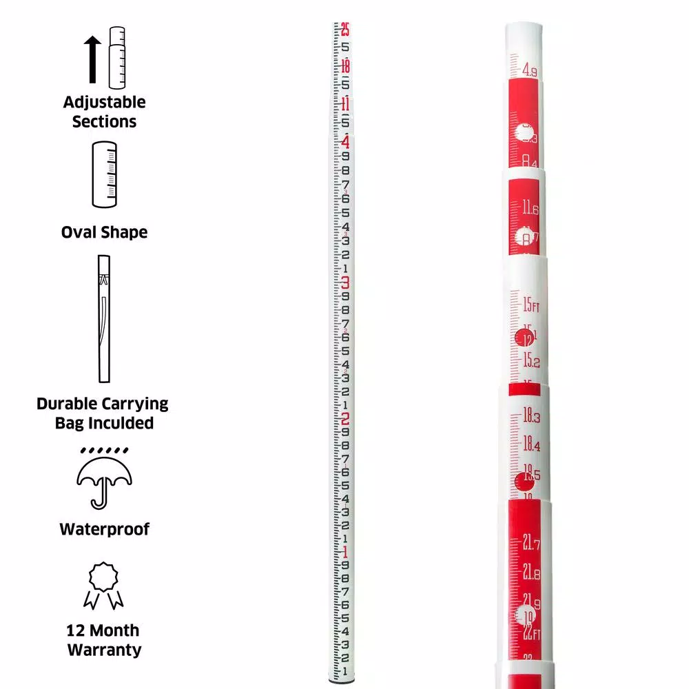 The AdirPro 25 ft. Surveyorβs Leveling Oval Shaped Rod is a perfect measuring tool for construction and surveying professionals. It can be collapsed from 25 ft. to 58.5 in. for easy storage and portability. It has easy-to-read measurements that are in feet. and tenths and marked by alternating black and red graduations with a white background. It has adjustable sections that provide choices of length and theses sections can be locked to secure the desired measurement. This leveling rod is made of fiberglass with an oval shape and is stabilized with ribs for reinforcement. It is waterproof, non-conductive, and wear-resistant. Accessories can easily be attached to it through its 5/8 in. x 11 in. thread. Also included is a durable carrying bag.