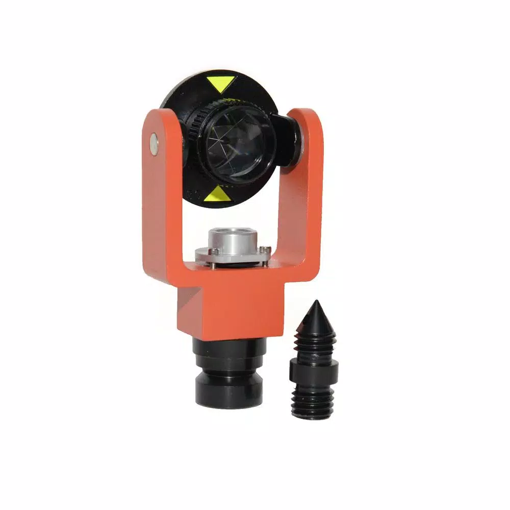 The AdirPro Mini Prism System with Center Vial is both compact and comprehensive. The fog-resistant mini prism itself is copper-coated, 1 in. (25 mm) Dia and is held in a sturdy all-metal frame. It is compatibility with products from Leica, Nikon, Pentax, Sokkia, Topcon, Trimble and more. It can also be secured at 3 heights (70 mm, 100 mm or 115 mm) on tribrach plates and prism poles. The prism can be tilted on the friction axis and has an offset of 0 mm or -30 mm. The full system contains an S-hook and plumb bob bracket for handheld work and a prism point to stake.