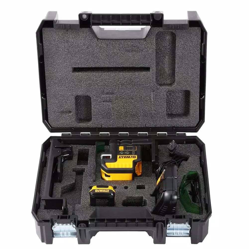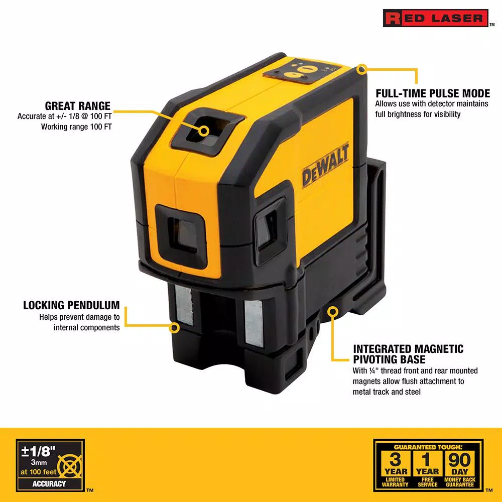 The DEWALT Red 3 Spot Laser Level has a locking pendulum. Designed with overmold housing to protect the laser from drops. It also includes an integrated magnetic bracket and hang hold making it easy to mount on various surfaces.