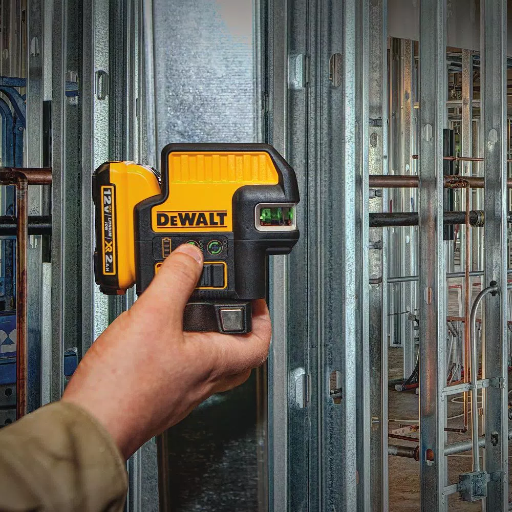 Introducing DEWALTβs new 12-Volt Compatible GREEN Cross-line plus 2 Spot Laser. This laser features 4 total beams (2 spots and 2 lines) and is built to last. Included is the laser itself along with an AA Starter pack, extended ceiling bracket, target card and enhancement glasses. Itβs green beam provides enhanced visibility and extended range.