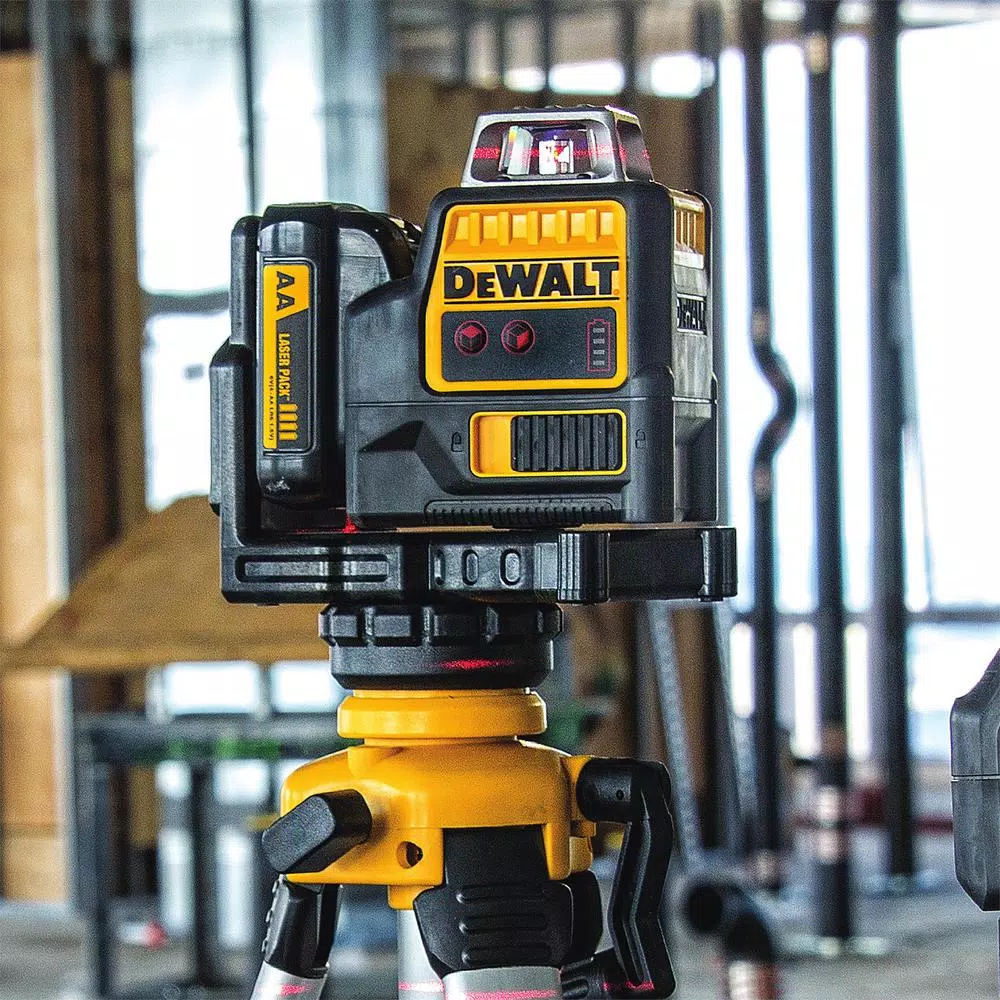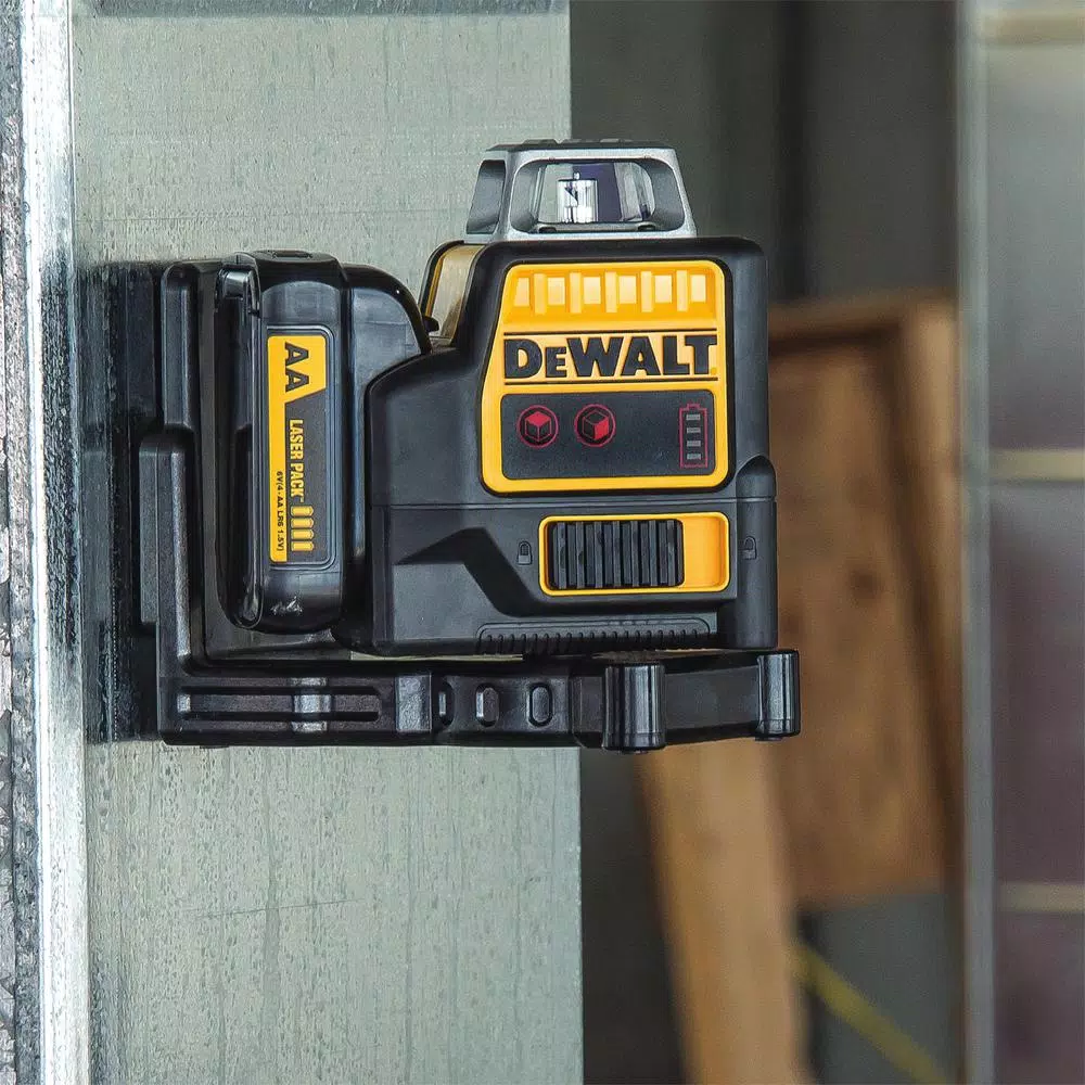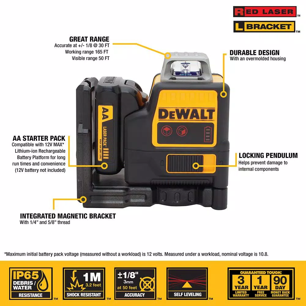 The DEWALT DW0811LR 12-Volt MAX 2 x 360Β° Red Line Laser has dual 360Β° line lasers to aid in full room layout. It provides great visibility and alignment for wall track layout. The full time pulse mode allows use with detector while maintaining full brightness for visibility and extended range. The rear mounted magnets allow flush attachment to metal track and steel.