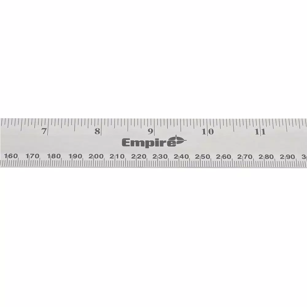The Empire 18 in. Stiff Ruler is designed for long-term use. The ruler is crafted with stainless steel for strength and durability and features etched black graduations, allowing measurements to be read more clearly. It also features inch measurements up to 16ths and metric measurements up to millimeters. It has a hanging hole for easy storage.