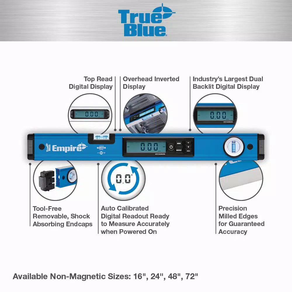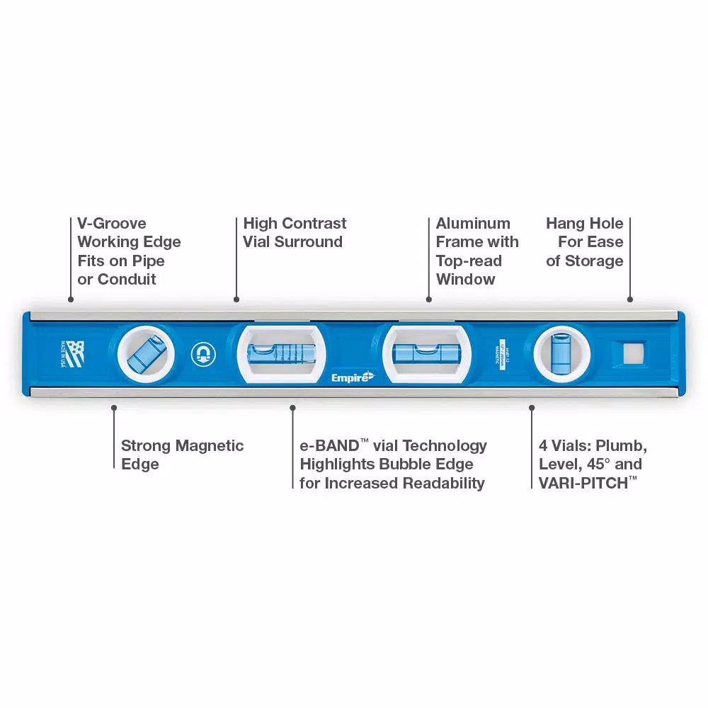 As the dominant market leader in levels, squares and marking products, Empire Level is committed to delivering innovative solutions designed to satisfy the needs of the modern jobsite. The e75 Series True Blue Box Level offers superior performance in the key areas of functionality and durability. The box levels are constructed with an all-metal frame as well as top and bottom precision-milled edges to deliver accuracy to within 0.0005 in. in all working positions. For added durability, the e75 series features a reinforced locking system that secures the vial settings and guarantees long-life accuracy. The e75 box level also equipped with rubber shock-resistant endcaps that are tool-free removable to enhance scribing performance into corners. Magnetic models boast high-strength rare earth magnets for superior holding power when working with door frames, steel studs, ferrous pipe and other common metal-working applications. The em95 UltraView LED Torpedo Level combines the professional features of the Empire True Blue Torpedo Level with the patented, UltraView technology to provide superior vial visibility in dark, low and bright light applications. The patented, UltraView system uses dual LEDS, optical brightener and e-Band vials to provide high definition viewing in all conditions. Its IP54 rating meets the durability demands of the jobsite by protecting it from dust and water.