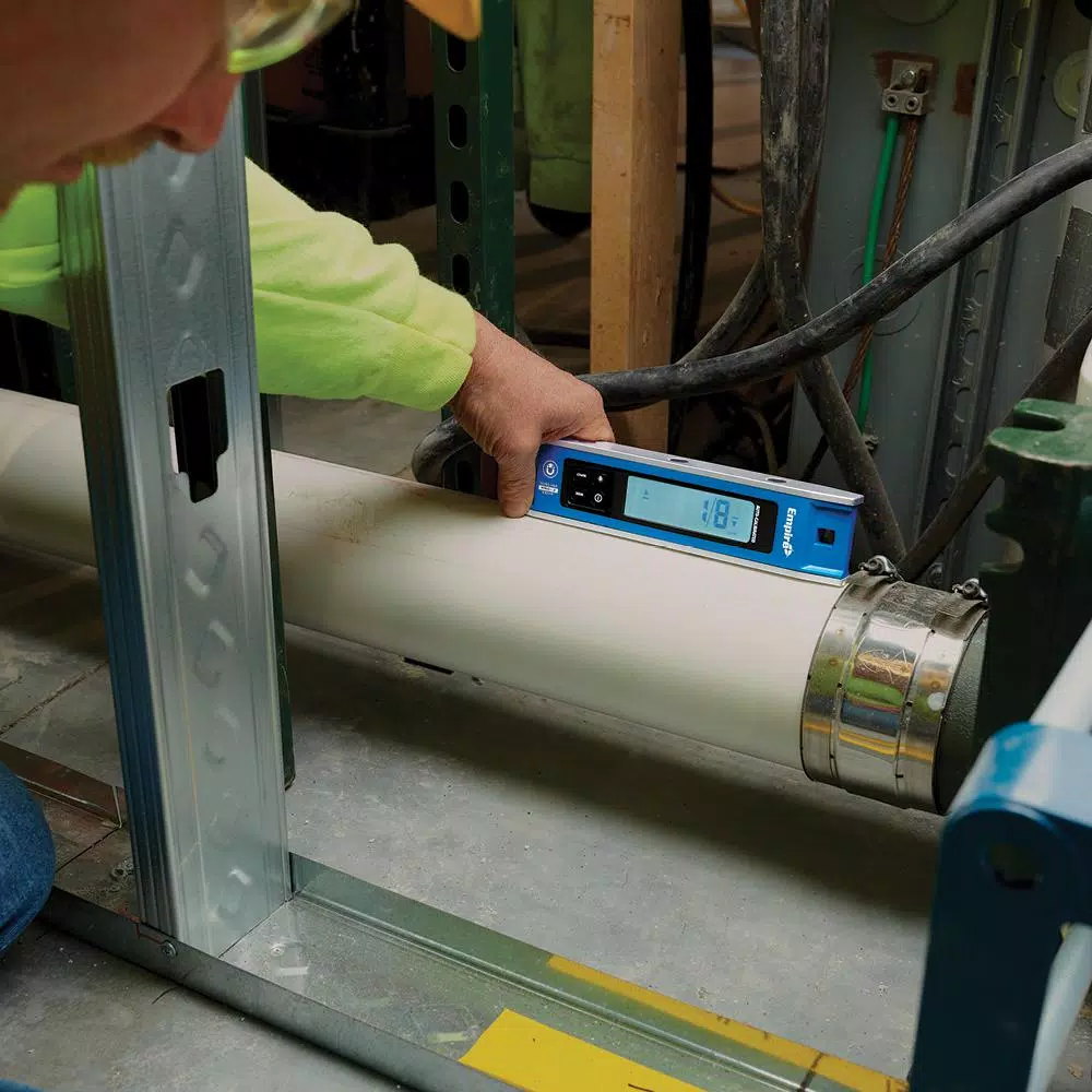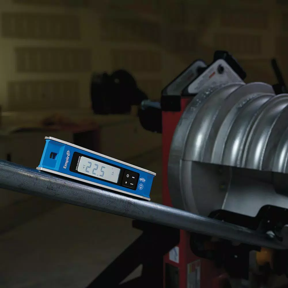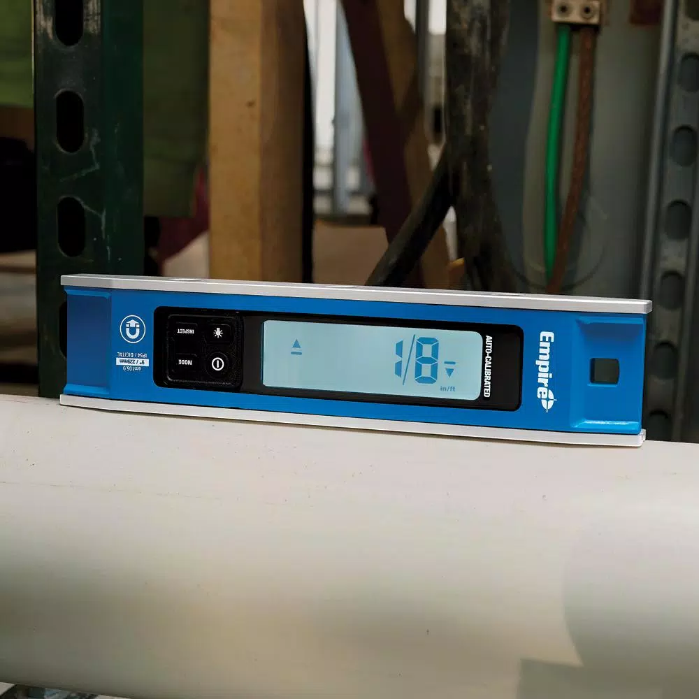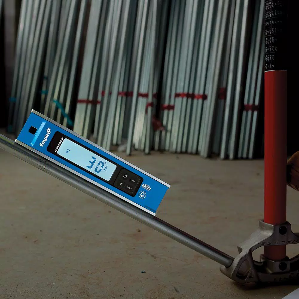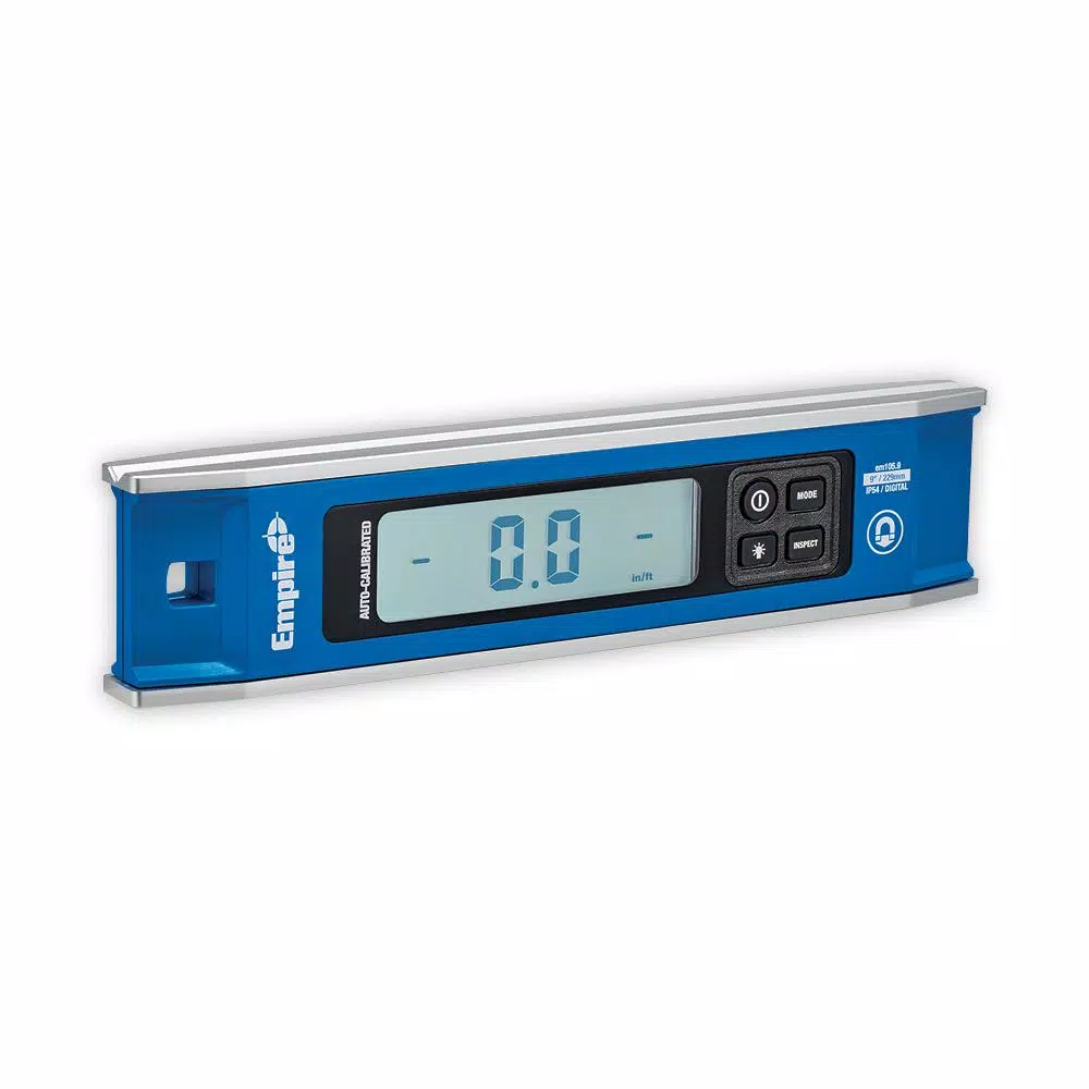 The Empire® em105.9 9″ Magnetic Digital Torpedo Level Level is ready to measure accurately when powered on and features auto-calibration allowing users to get a clear and precise digital readout immediately. The torpedo level features six measure display modes, enabling users to make precise measurements in a wide range of outputs. These include measurements in degree-tenths, mm/M. or percentage. Users also have the option to take rough-in mode measurements in degrees, in/ft. fractions or in/ft. decimals. For even further versatility, inspect mode enables users to zero out the digital torpedo level, which is ideal for conduit bending applications. The Empire magnetic digital torpedo level features rare earth magnets, allowing it to attach to most metal surfaces for ease of use.