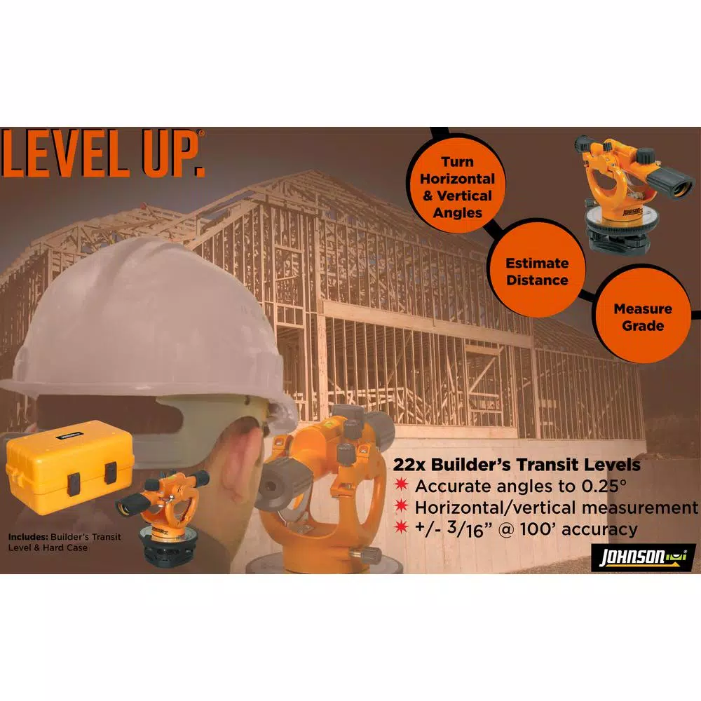 The Johnson 22X Builders Transit Level is accurate to +/- 3/16 in. at 100 ft. and boasts a working range of up to 200 ft. Itβs ideal for leveling foundations, driveways, patios, floors and other applications, and it has a built-in sunshade to improve sighting. This level includes a hard-shell case and instruction manual.