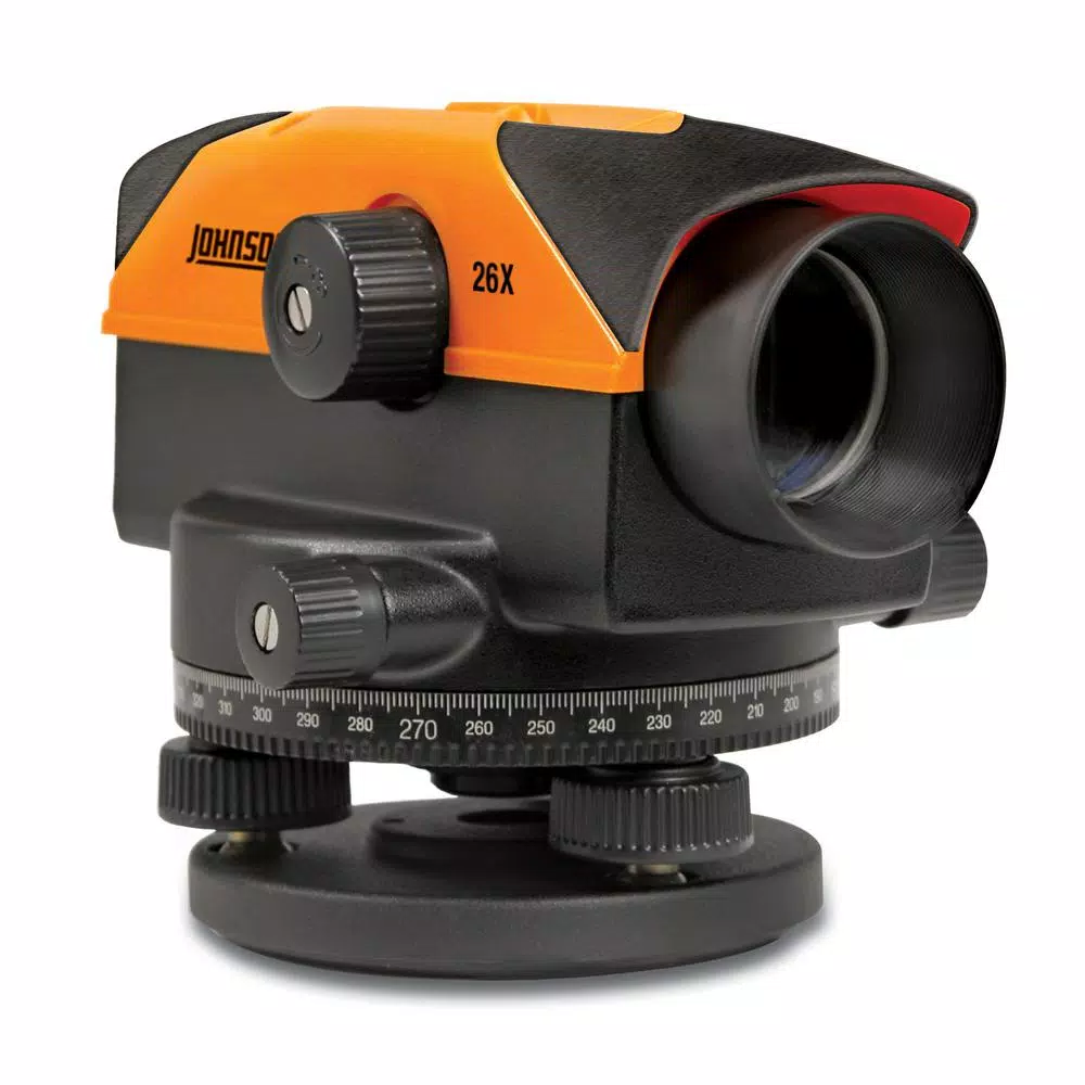 Make your next outdoor project run faster and more accurately with Johnsonβs automatic level featuring a 26x power lens for strong magnification. This easy-to-use level features a large, ergonomic focusing knob, prism for viewing the bubble and top-mounted quick-sight for easy viewing of your grade rod. Accuracy is never an issue with this automatic level β itβs equipped with fine adjustment knobs, focusable cross-hairs, 360-degree horizontal sighting circle and 1:100 stadia for distance estimation, which means you can dial in your measurements exactly, every time. The automatic level is also water and dust resistant, making it safe to use on nearly any jobsite. This level also comes with a hard-shell carrying case to keep your tool clean and safe when not in use. If youβre looking for a tripod and grade rod to accompany the level, consider Johnsonβs Model 40-6928 26x automatic level system.