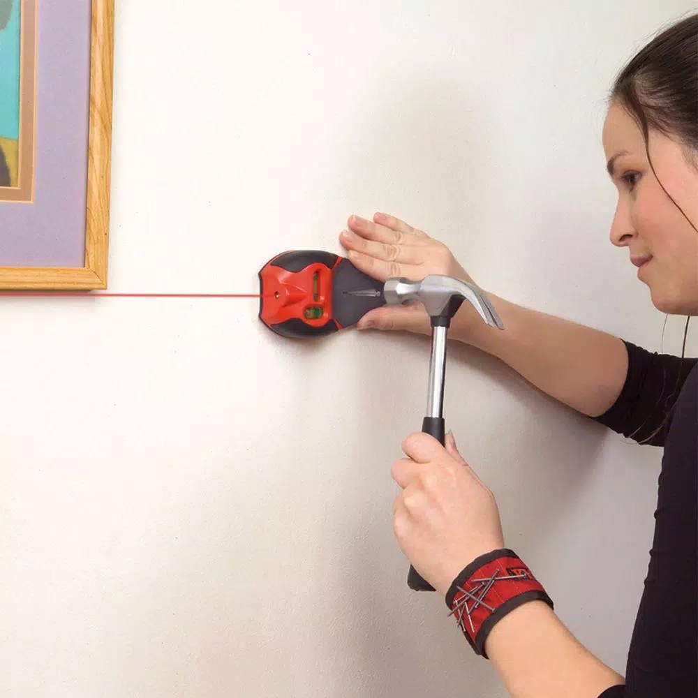 The Pro Laser Nail Gripper is used for hanging shelves, pictures, mirrors and aligning panels, tiles and wall coverings. Highly visible line laser includes 2 easy to read vials β vertical and horizontal. Includes patented rubber grip that holds any size of nail/screw and includes a magnetic wristband for holdings nails and screws. Pressure activated on/off. Details include: Laser II class with a range up to 20 ft. (6m). 2 AAA batteries are not included.
