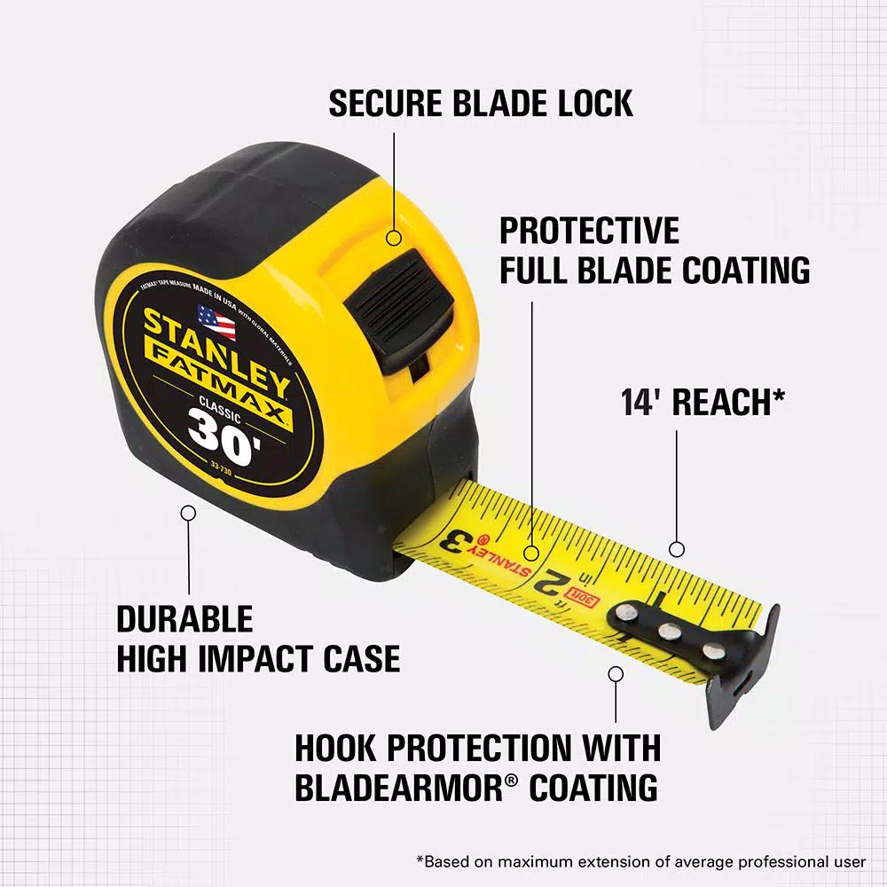 This tape measureβs case is made from quality high impact ABS. The blades durability is a result of a polymer coating. Stud markings are visible at 16 in. and 19.2 in.