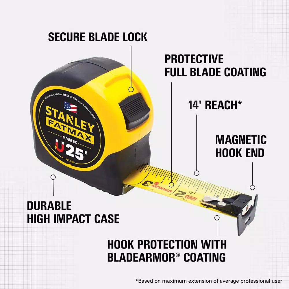 The Stanley FATMAX includes two 25 ft. FATMAX tape measures for the price of one. Each tape measure features a Mylar polyester film that extends the bladeβs life and comes with BladeArmor coating to ensure durability. The casing has a cushion grip to resist slipping, and the tape is connected to a strong spring for smooth retraction.