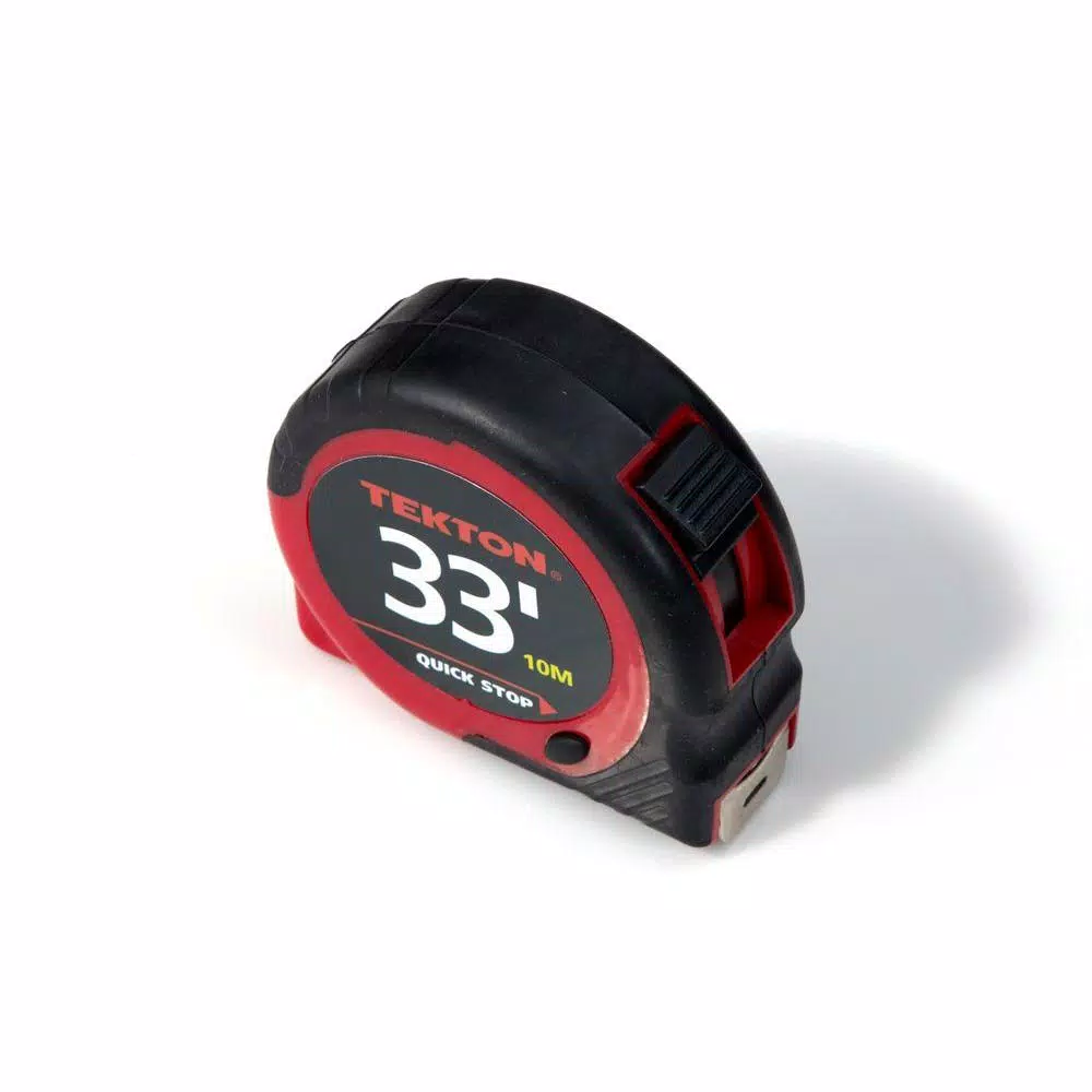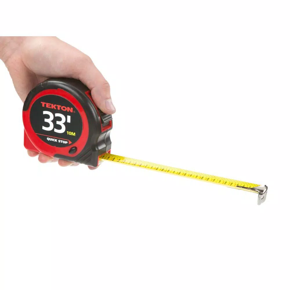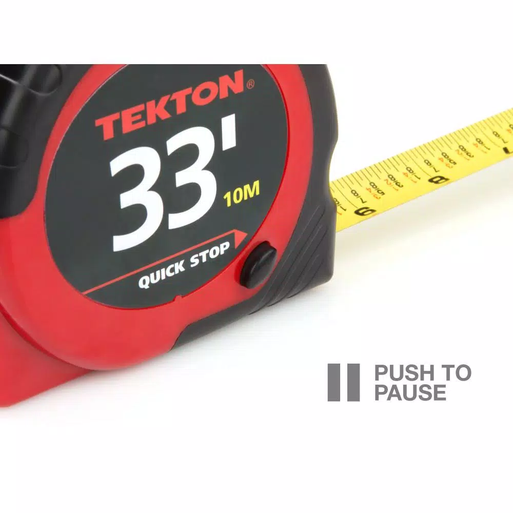 Measure, mark, and cut faster and more confidently with the TEKTON 33 ft. x 1 in. Tape Measure. It takes extra time to read regular tape measures, counting lines between numbers, double checking to make sure itβs right. Or worse, you can easily lose your place and read the wrong line, ultimately resulting in a frustrating and costly cutting mistake. Eliminate all that with these easy-to-read, easy-to-follow fractions every 1/8 in., marked in alternating black and red colors for even more clarity. Made of strong, impact-resistant ABS material, the compact housing is designed to fit comfortably in your hand. Non-slip, rubber grips give you extra control, preventing drops. Activate the thumb switch and the tape locks in place for hands-free marking or use the one-touch pause button to momentarily hold tape position for quick marks or double checking a measurement. For accurate measurements, the four-rivet end hook slides to compensate for hook thickness. Snap the belt clip onto your tool belt, pouch or pocket and this tape goes anywhere you go.